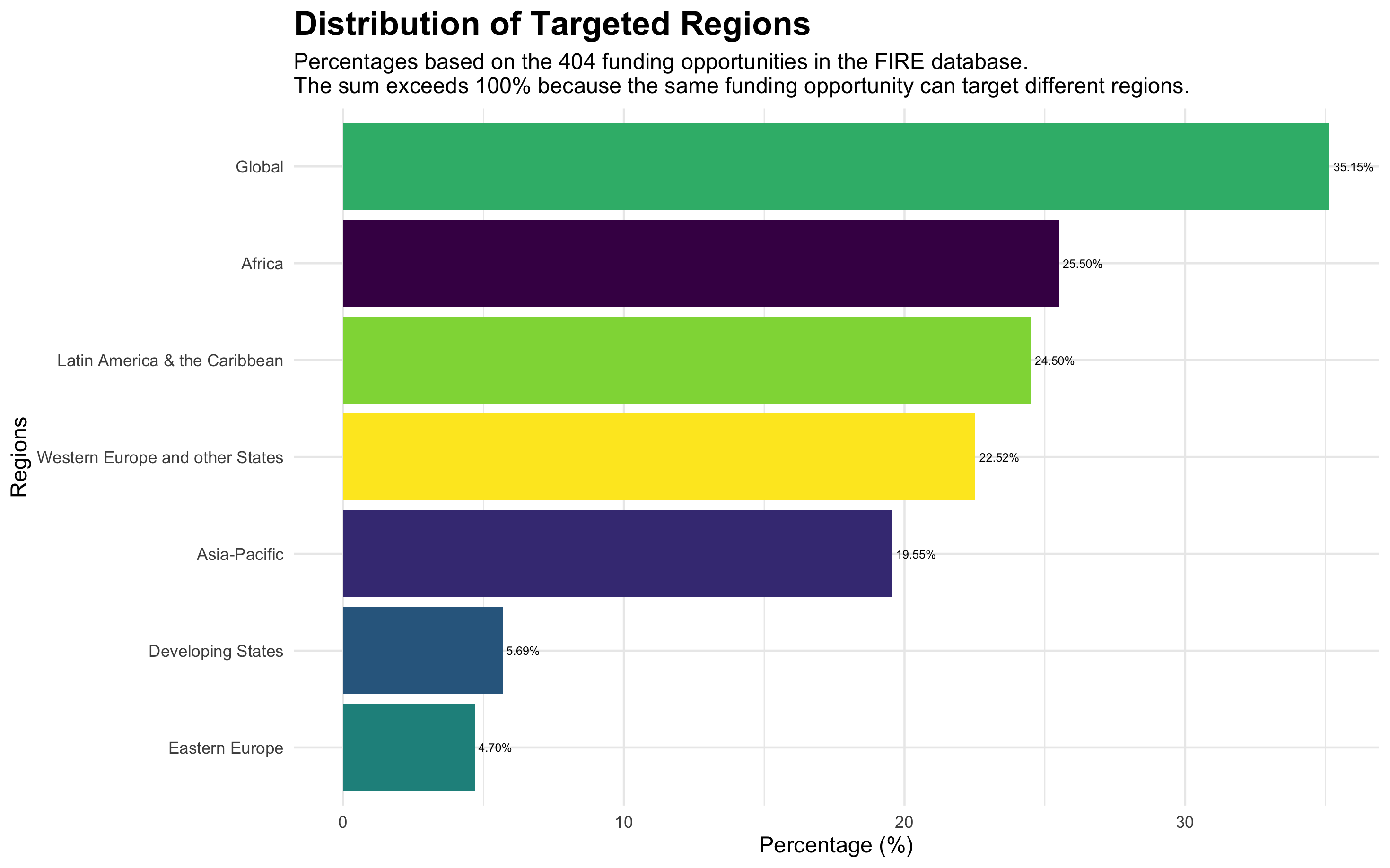 While 35.15% of the funding opportunities have a global scope, some funding opportunities focus on specific regions. 25.5% explicitly mention at least one African country, 24.5% explicitly cover Latin America and the Caribbean, and 22.52% mention at least one country in Western Europe, the United States, Canada, New Zeeland or Australia. Asian and Pacific countries are the explicit target of 19.55% of the funding opportunities. Moreover, 5.69% of the funding opportunities are focused on developing countries, in general terms3.