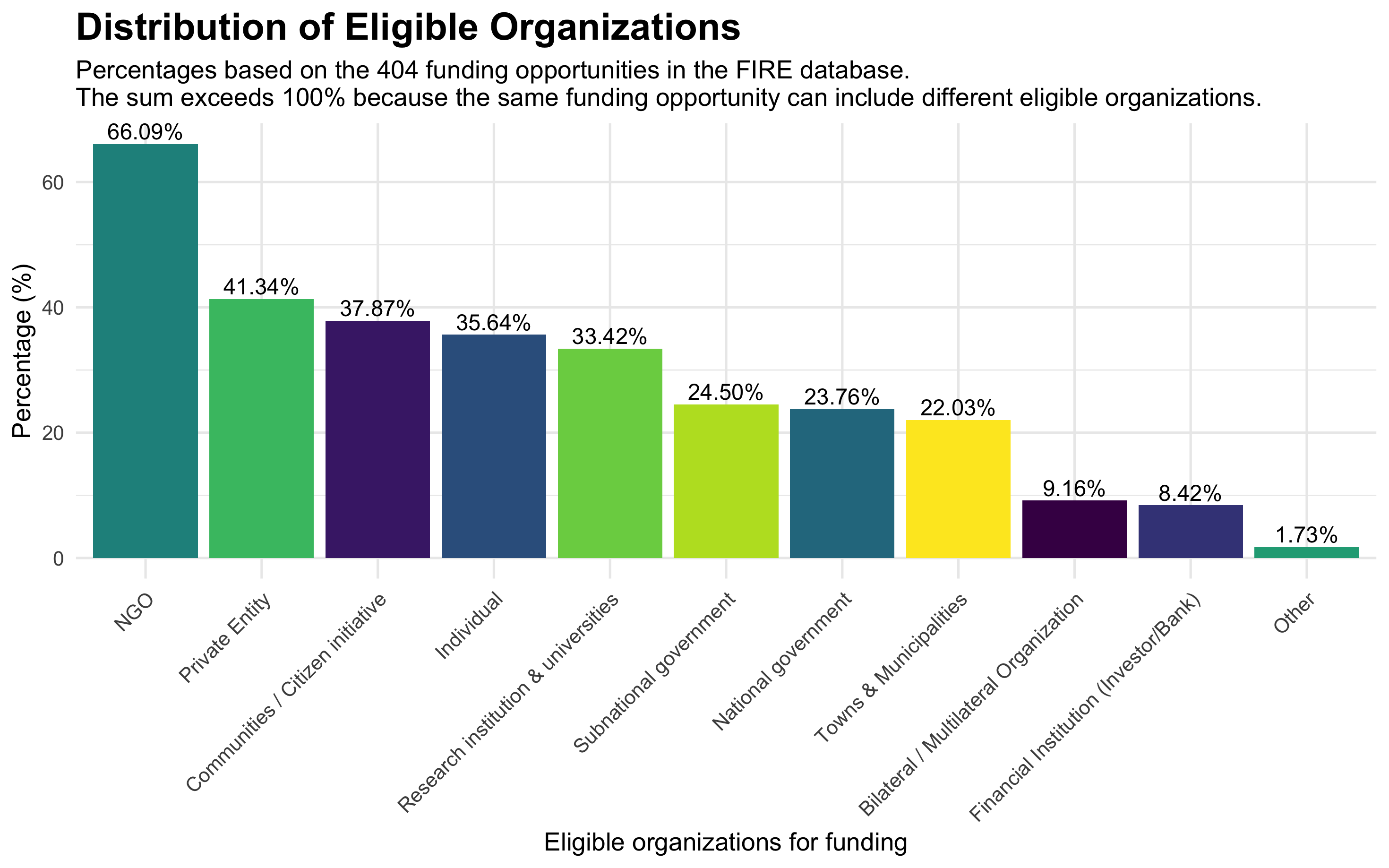 Most biodiversity finance opportunities target non-profit or civil society organizations, which are eligible to apply for 66.09% of them. Private entities come next in line, accessing 41.34% of the opportunities. They are succeeded by communities and citizen initiatives (37.87%), individuals (35.64%), research institutions & universities (33.42%), subnational governments (24.5%), national governments (23.76%), and towns and municipalities (22.03%).