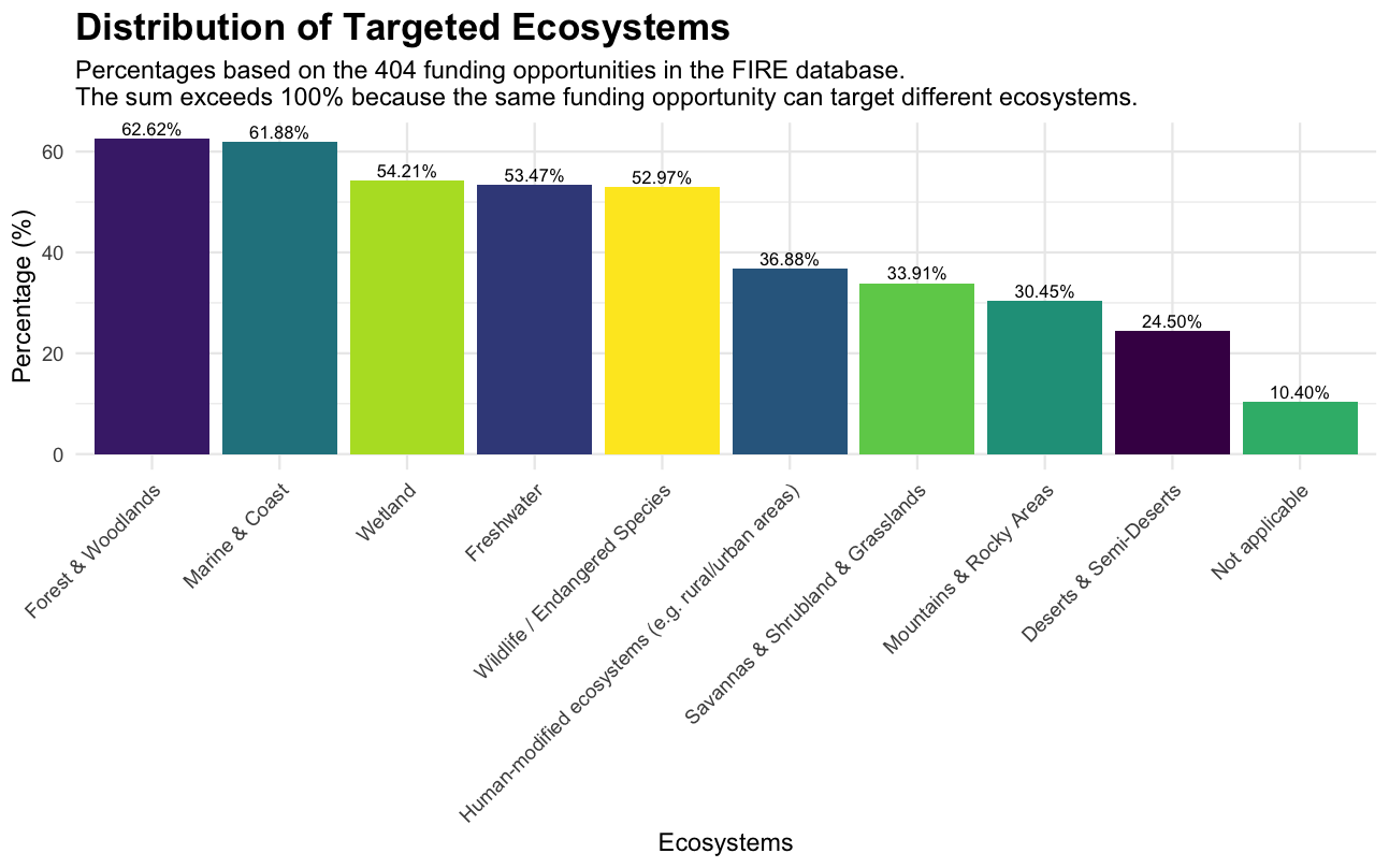 Regarding particular ecosystems, forests and woodlands are the focus of most opportunities (62.62%), followed by marine and coastal ecosystems (61.88%). Wetlands, freshwater, and wildlife/endangered species are also fundable by over half of the funding opportunities.