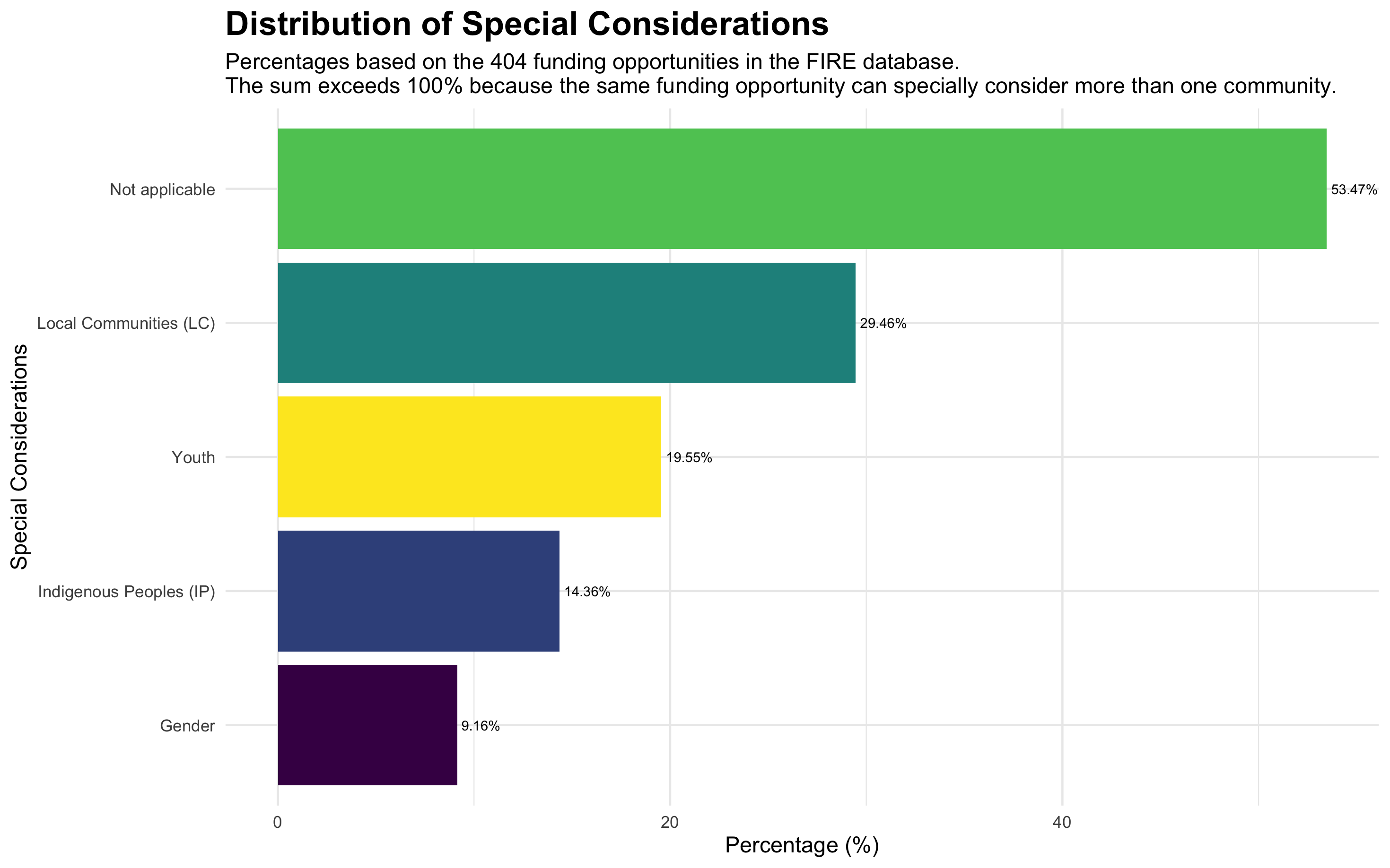 Despite this, 53.47% of the mapped funding opportunities do not specifically consider any socially vulnerable group. Among those that do, 29.46% prioritize local communities, 19.55% focuses on youth, and 14.36% on Indigenous peoples. Only 9.16% of opportunities adopt a gender-responsive approach.