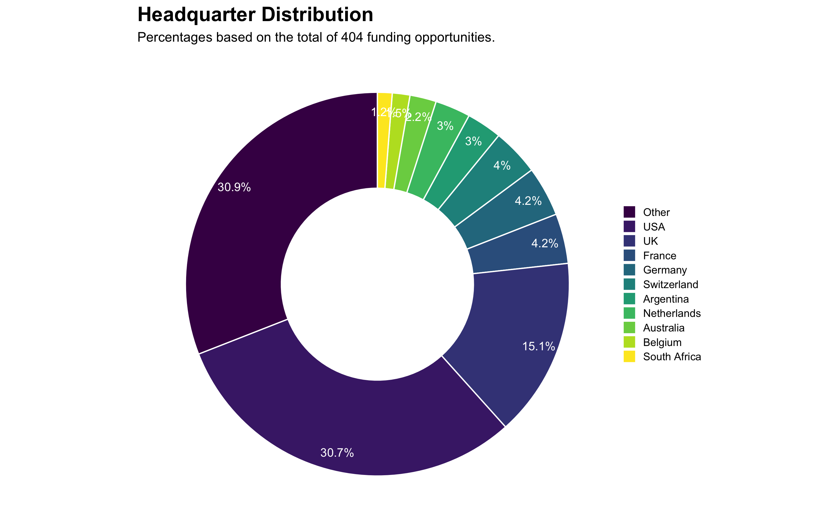 Most organizations providing funding are solely headquartered in the United States (30.7%), followed by Western Europe. In detail, 15.1% of the organizations are solely headquarted in the United Kingdom, 4.2% in Germany, 4.2% in France, and 4% in Switzerland. Together, these five countries account for 58.2% of all organizations. Three organizations are co-headquarted in two different countries: one in the United States and Switzerland, the other in the United Kingdom and Singapore, and the other in Kenya and Italy.