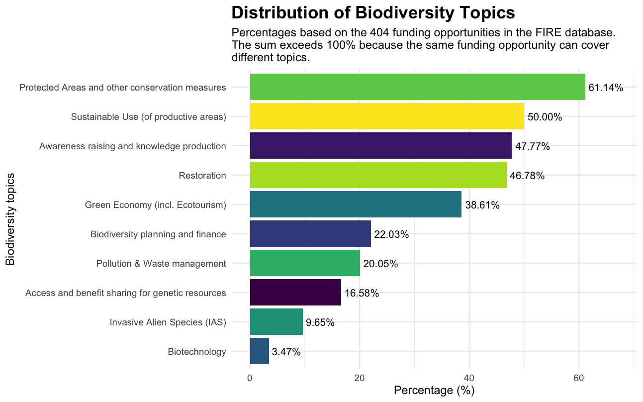 Out of 398 funding opportunities, 61.14% focus on supporting protected areas and other conservation measures. 50% target the sustainable use of protected areas, 47.77% address awareness raising and knowledge production activities, 46.78% focus on restoration, and 38.61% support green economy initiatives such as ecotourism. It is important to note that these categories are not mutually exclusive, and a single funding opportunity can cover different biodiversity topics. Other topics such as biodiversity planning, pollution and waste management, access and benefit sharing for genetic resources, invasive alien species, and biotechnology are considerably less prioritized.